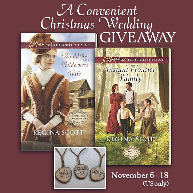 - 1 winner will receive: Signed copies of Would-Be Wilderness Wife (which introduced Simon Wallin, the hero of A Convenient Christmas Wedding) and Instant Frontier Family (which introduced Nora Underhill, the heroine of A Convenient Christmas Wedding), and a set of pioneer Christmas ornaments that say "Joy, Peace, Love."