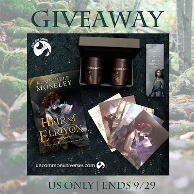 Paperback of Heir of Elriyon by K. Michele Moseley, a set of two loose-leaf teas, a set of character art, and a bookmark (US Only)